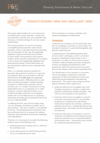 The characterisation of a use is not always a straightforward proposition and involves questions of fact, to be determined by evaluating the circumstances of the case, the applicable legislative regime and the planning context.1 In other words, characterising a use requires analysis of the activities and premises in question, in the context of the applicable legislation and planning instruments. In this cheat sheet, we provide guidance about how to undertake that exercise.